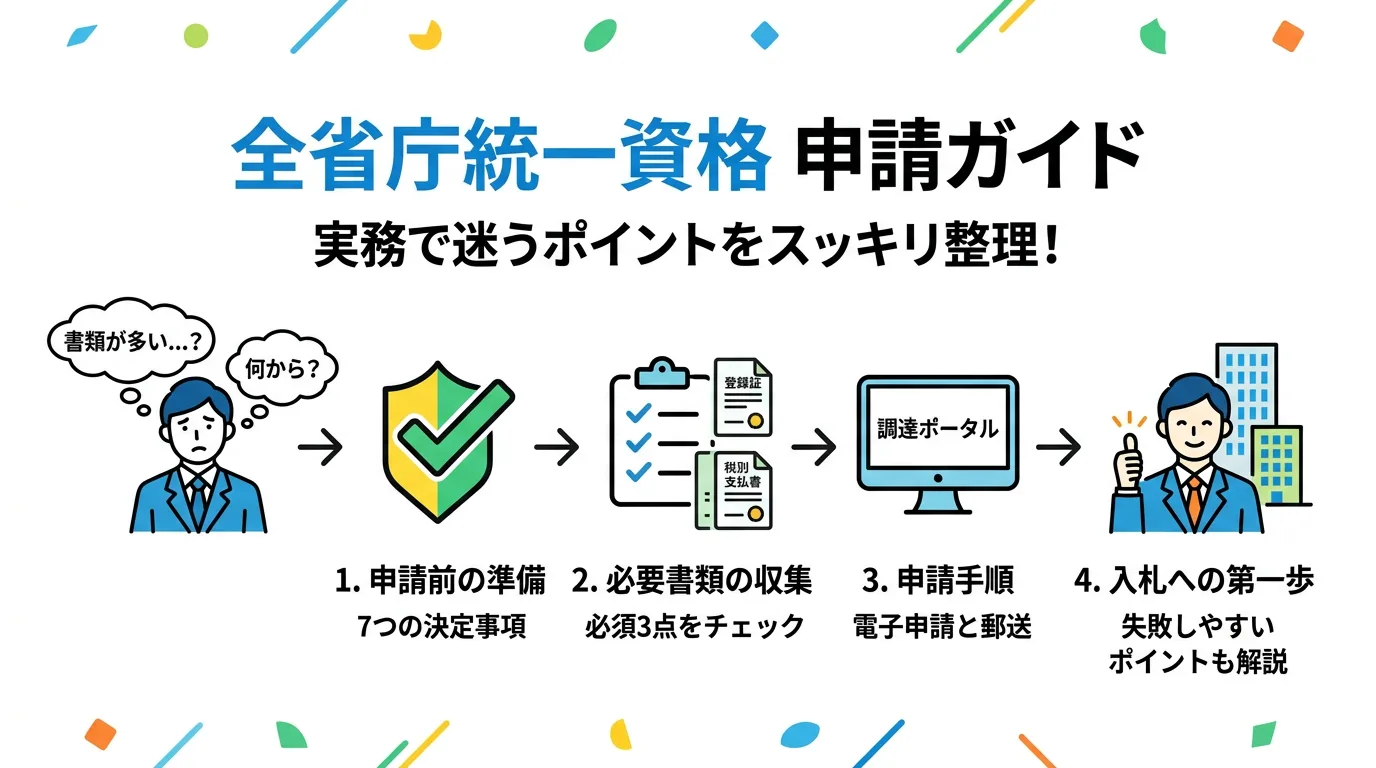 国の入札に参加するための「全省庁統一資格」。初めてだと書類集めや調達ポータル入力でつまずきがちです。必要書類(発行3か月以内など)から申請手順、電子入札の準備、よくある失敗と対策まで実務目線でまとめます。