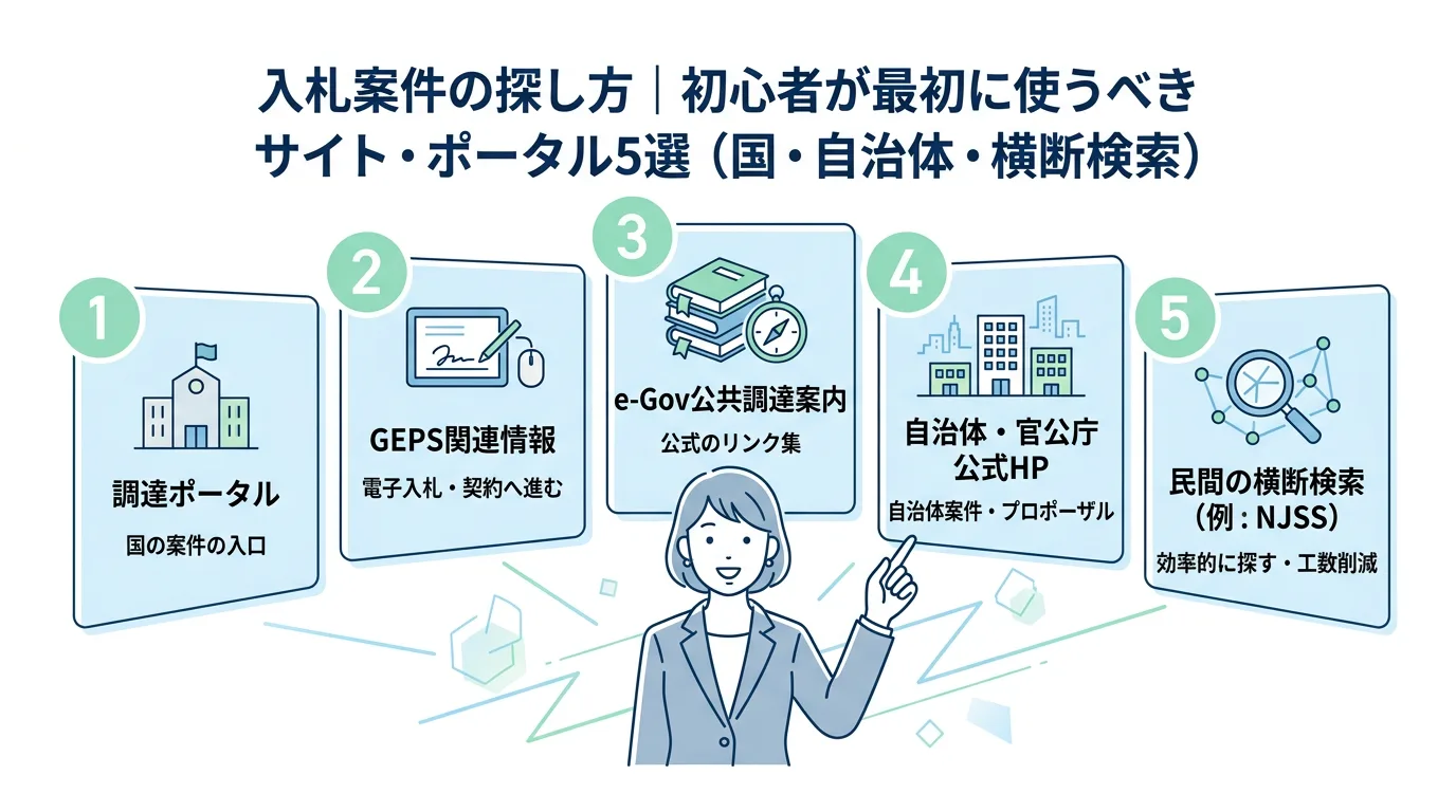 入札を始めたいのに「どこで案件を探せばいいか分からない」と手が止まる初心者向けに、国の公式入口「調達ポータル」、GEPS、e-Gov案内、自治体HP、民間の横断検索まで“探し先”を5つに整理。使い分けと見落としを減らすコツを実務目線でまとめます。