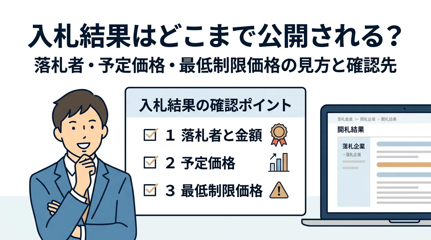 官公庁・自治体の入札結果は原則公開ですが、公開項目や期間は発注機関で差があります。本記事では「落札者・予定価格・最低制限価格」を中心に、国(調達ポータル)と自治体の確認先、読み解き方、次回入札に活かすコツを実務目線で整理します。