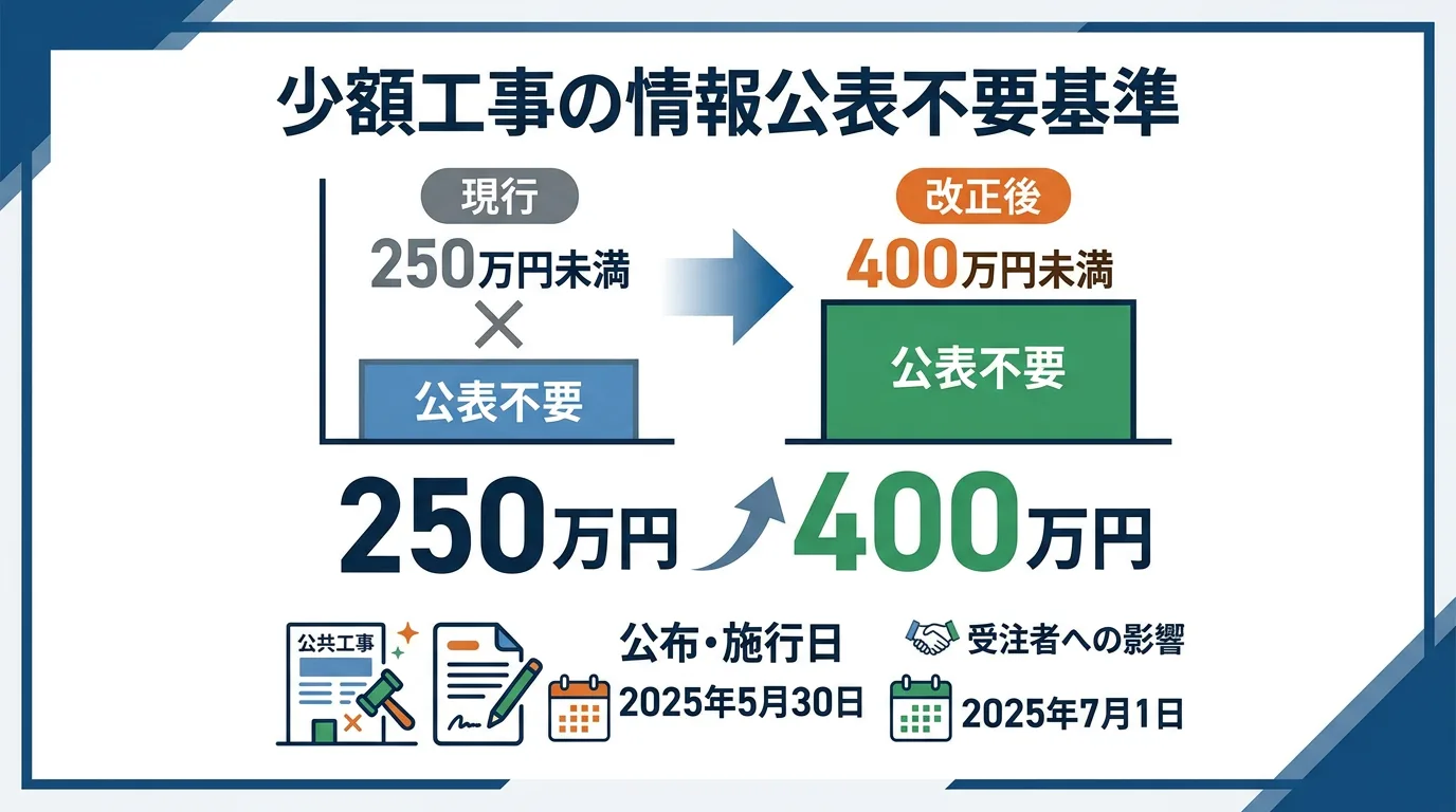 公共工事の「発注見通し」「入札・契約内容(入札結果等)」の情報公表で、公表不要となる少額工事の基準が250万円から400万円へ引き上げられました(入契法施行令)。公布日・施行日と、受注者側の案件探索や分析への影響、実務での対策を整理します。