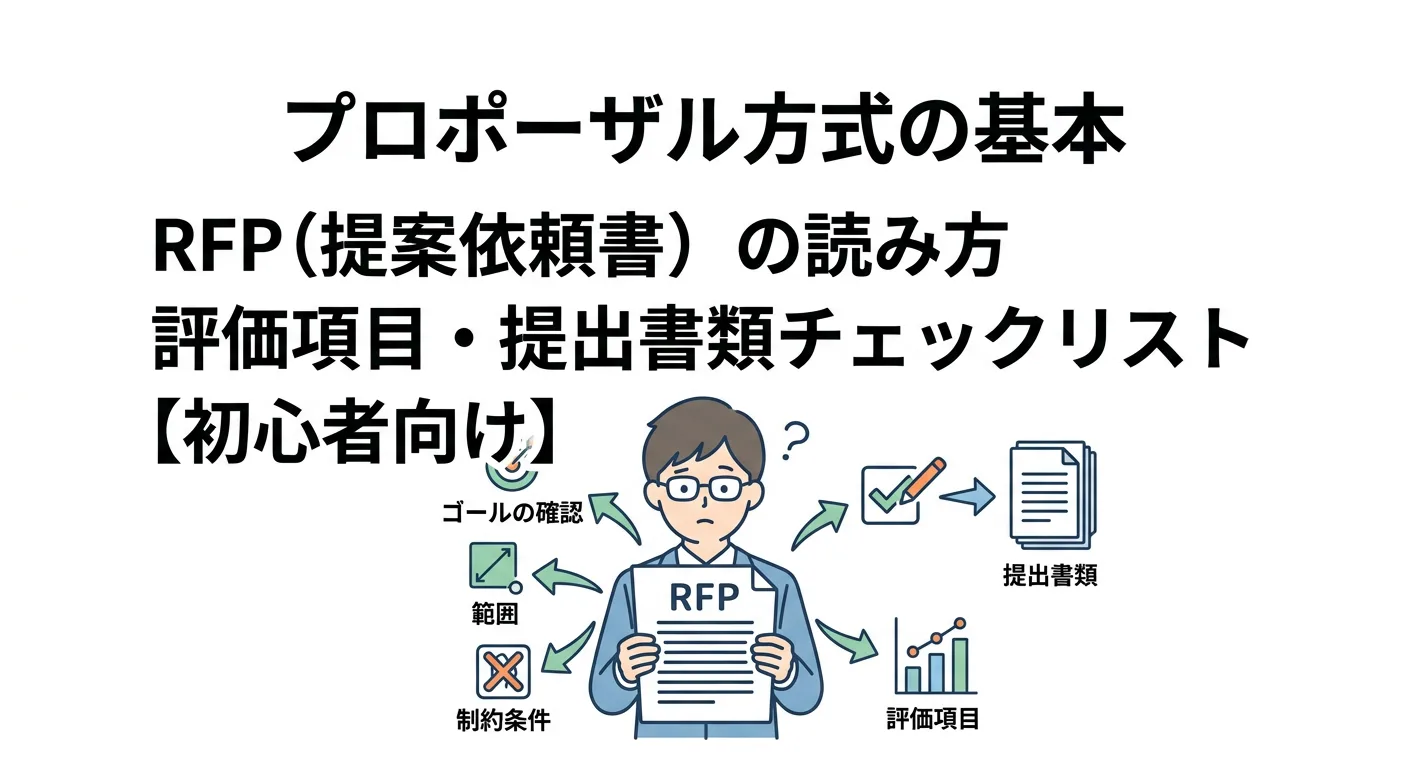 プロポーザル方式は価格だけで決まらず、提案内容や体制・実績まで見られるため「何を読んで、何を出せばいいか」で差がつきます。本記事では、プロポーザルの位置づけ、RFPの読み方、評価項目の典型、提出前チェックまでを実務目線で整理します。