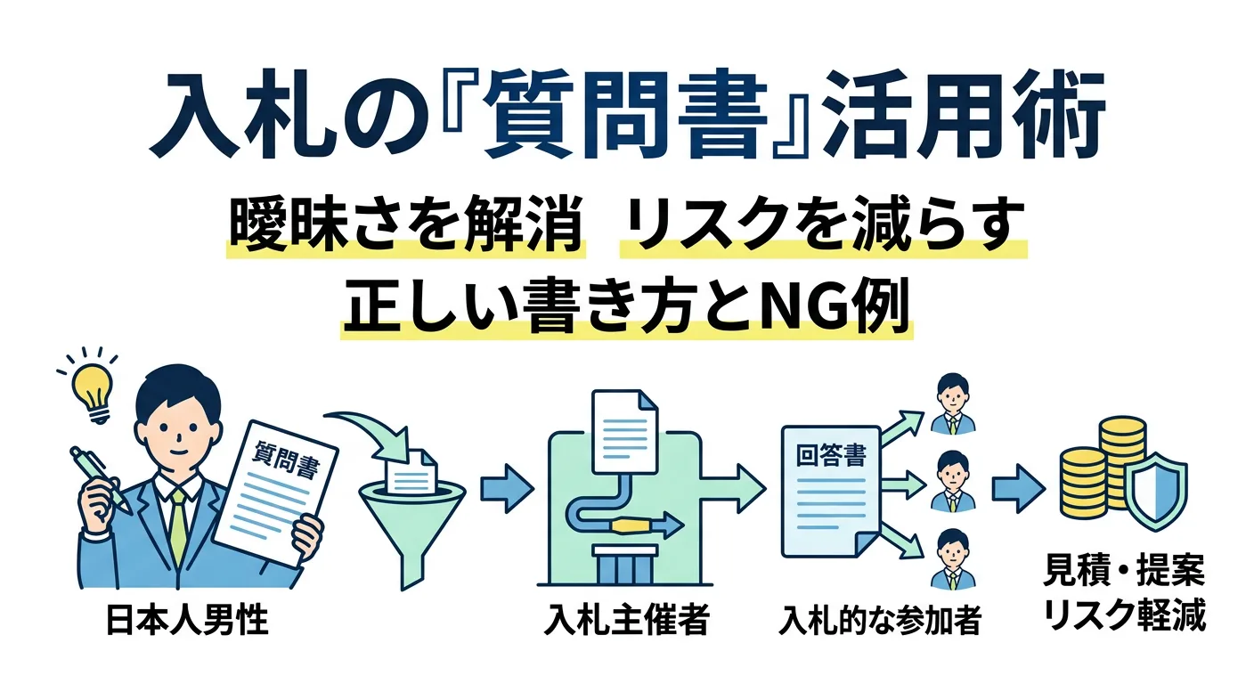 入札の仕様書や入札説明書は、読み込むほど「これ、どっちが正しい?」が出てきます。そんなときに頼れるのが質問書(質疑)です。本記事では、質問できる時期の目安、聞くべき論点、すぐ使える書き方テンプレ、やりがちなNG例、そして回答(Q&A)を見積・提案に反映する実務手順まで整理します。