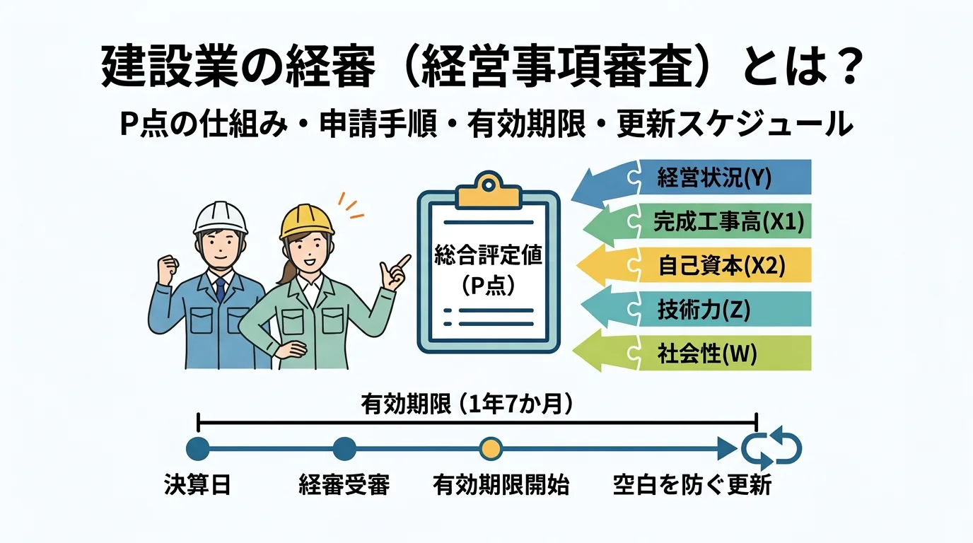 公共工事に新規参入する際に避けて通れない「経営事項審査(経審)」。本記事では、経審の位置づけ、P点(総合評定値)の考え方、申請の実務フロー(Y→XZW→P)、有効期限が“通知日ではなく決算日基準”で1年7か月である点、そして経審切れ(空白)を防ぐ更新スケジュールの組み方を、初心者向けに具体化します。