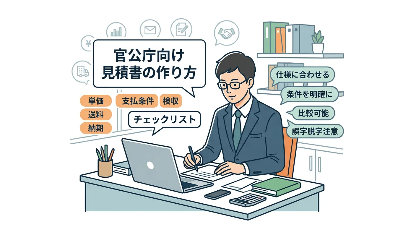 官公庁向けの物品見積書は、安く見せるより「公告・仕様・契約条件にズレなく合わせる」ことが重要です。本記事では、単価・送料・納期・検収・支払条件の5点を軸に、比較されても不利になりにくい見積書の作り方と注意点をチェックリスト形式で整理します。