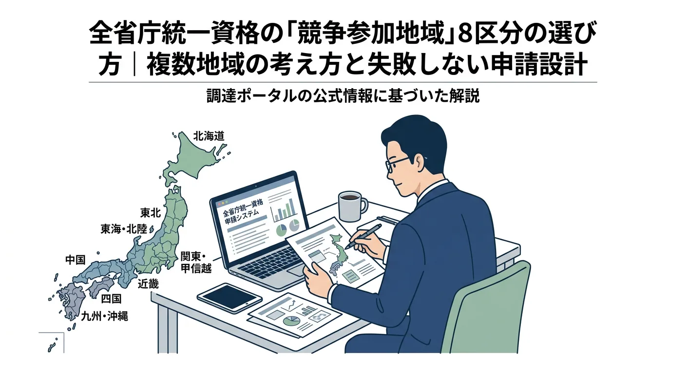 全省庁統一資格は「どの地域で競争に参加するか」を申請時に選びます。8区分の意味を正しく理解し、複数地域を選ぶときの落とし穴(地域条件・履行体制・電子入札準備)を避ける設計手順を、実務目線で整理します。