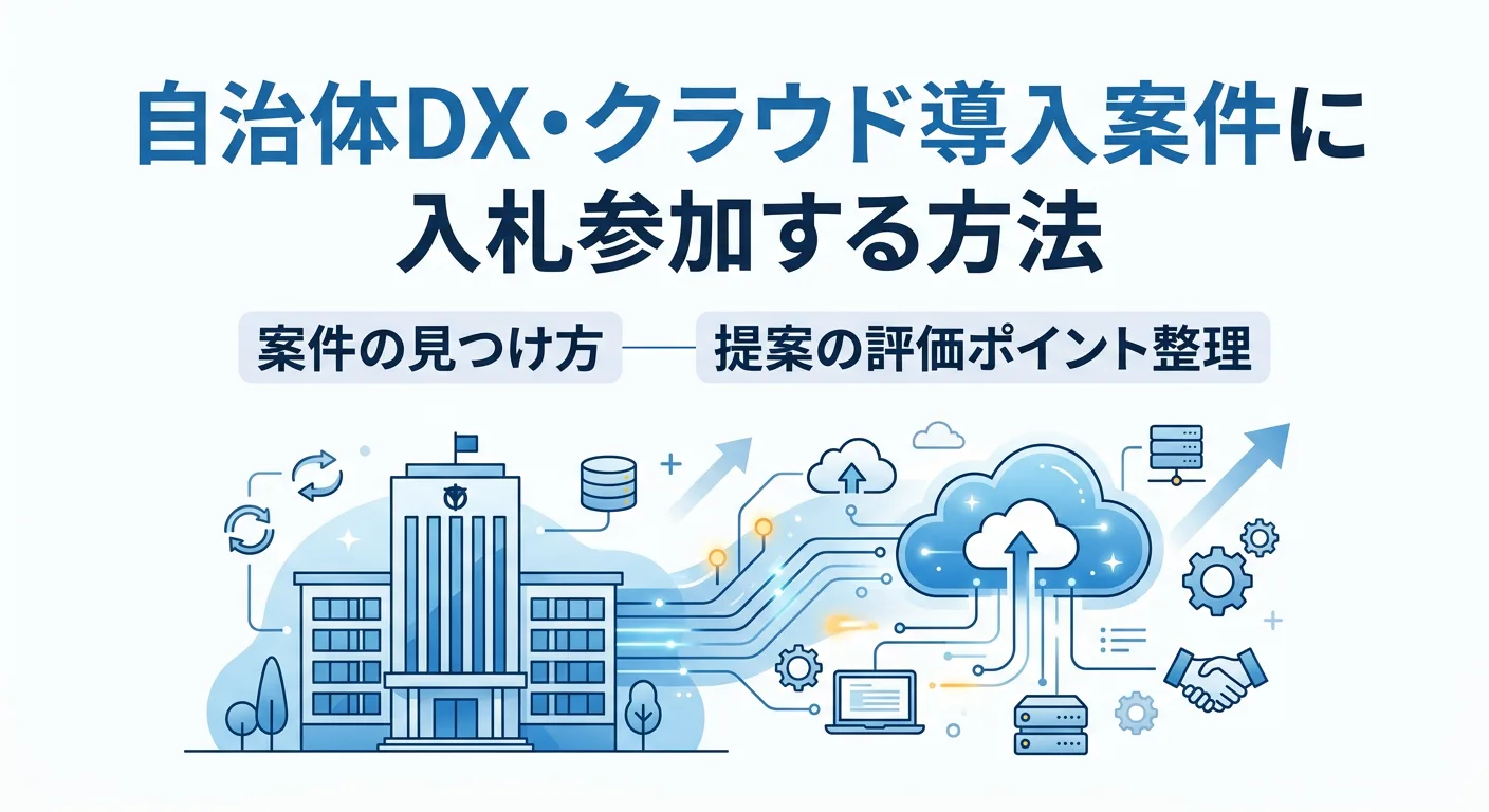 自治体DX・クラウド導入案件に挑戦したい中小企業向けに、入札参加資格の考え方(発注機関ごとに必要)、案件の探し方(入札情報+プロポーザル)、提案で見られる評価軸(体制・実績・セキュリティ・LCC)を実務目線で整理。締切管理やチェックシート対応のコツもまとめます。