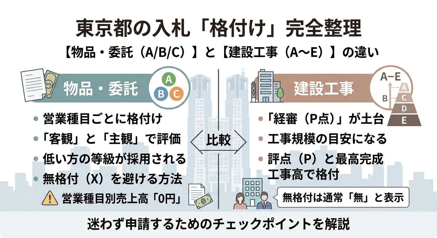 東京都の入札でよく聞く「格付け(ランク)」は、物品・委託と建設工事で仕組みが別物です。本記事ではA/B/CやA〜Eがどう決まるか、無格付(X)になる典型原因と回避策、申請・案件探しの実務導線までを整理します。