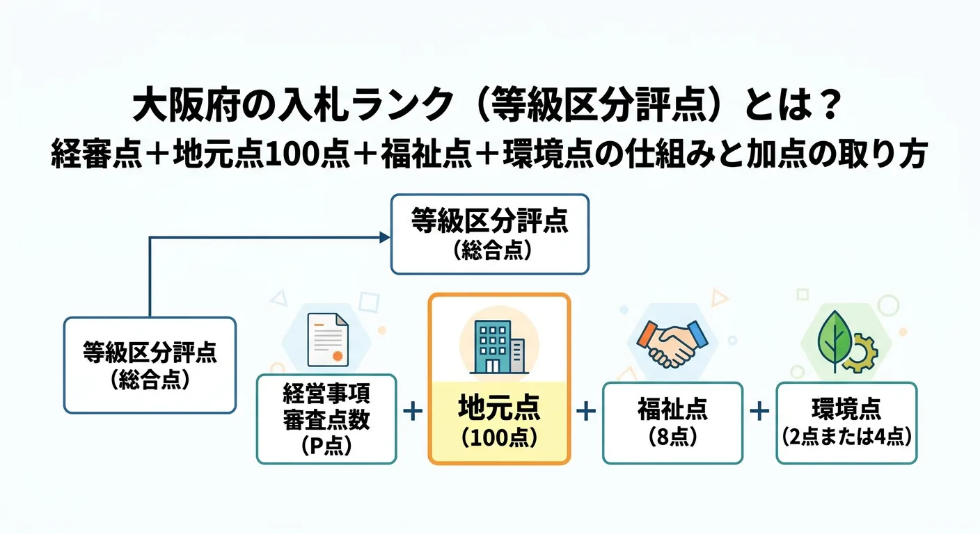 大阪府の建設工事入札で使われる「等級区分評点(入札ランク)」は、経審のP点を土台に、地元点100点・福祉点8点・環境点(2点/4点)を上乗せして決まります。本記事では算定式、対象工種、等級と工事金額の関係、主観点の“加算希望”の落とし穴、点を取りにいく実務手順まで整理します。