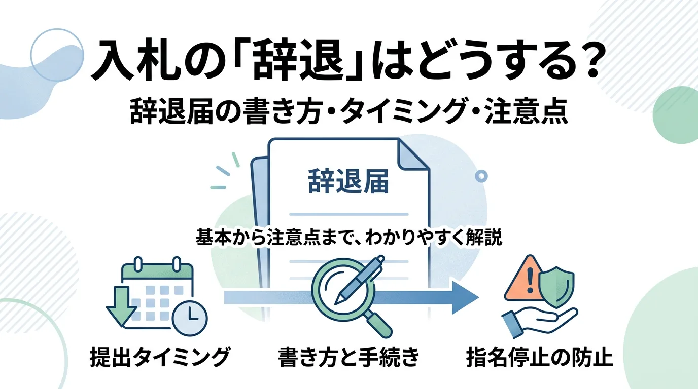 入札に参加したものの、体制不足や積算のズレで「辞退したい」と感じる場面は珍しくありません。辞退は手続を誤ると不誠実と受け取られ、指名停止などのリスクも。辞退届の書き方、提出タイミング(提出前/提出後/開札前)、電子入札での手順、ペナルティ回避の判断基準を実務目線で整理します。
