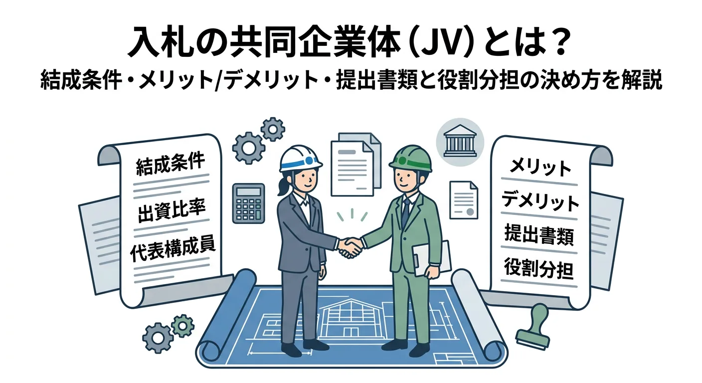 共同企業体(JV)は、複数社で1つの工事を受注・施工するための仕組みです。特定JVと経常JVの違い、甲型・乙型の責任と損益、発注者が求める結成条件や提出書類、協定書で役割分担を固める手順まで、入札初心者が迷いやすい実務ポイントに絞って整理します。
