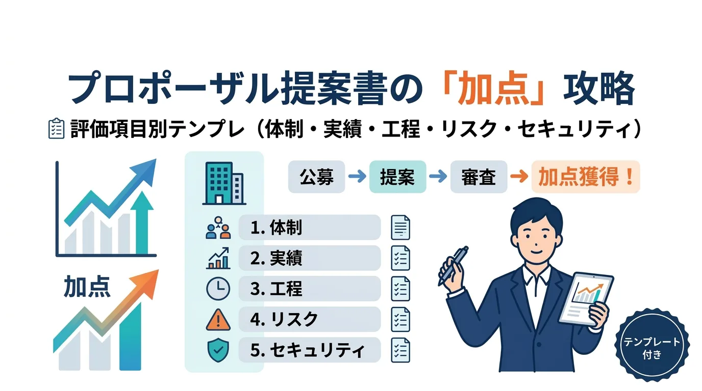 プロポーザルは価格だけで決まらず、提案内容の総合力が評価されます。本記事では審査で頻出の「体制・実績・工程・リスク・セキュリティ」を、採点されやすい形に落とす“加点テンプレ”として整理。コピペして骨子にできる見出し例・表の型・書き方の注意点をまとめます。
