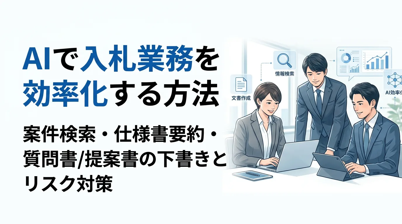 入札は「探す・読む・確認する・書く」の反復作業が多く、初心者ほど時間が溶けがちです。生成AIを“下書き・要約・チェックリスト化”に絞って使うと、品質を落とさず効率化できます。本記事では具体プロンプト例と、機密漏えい・誤情報・著作権リスクの実務対策をまとめます。