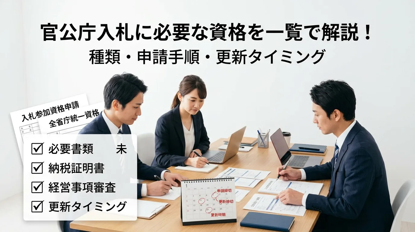 官公庁入札は「案件を探す前」に資格の整理が必要です。本記事では、国の全省庁統一資格、自治体ごとの入札参加資格、公共工事で必須となる経営事項審査(経審)を一覧で整理。申請手順の型と、失効しやすい更新タイミングの管理ポイントまで実務目線でまとめます。