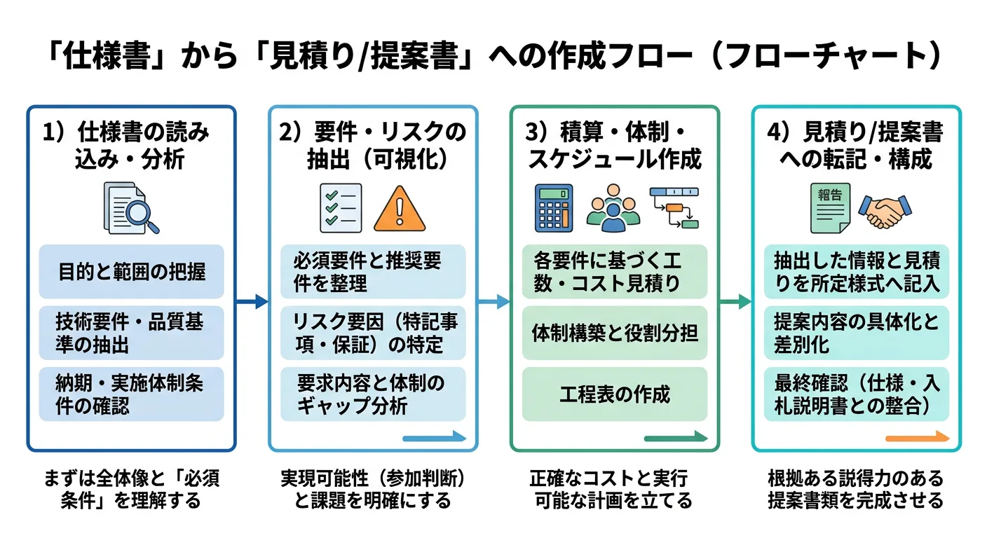実務の要点:仕様書の要求事項を満たすだけで満足せず、「評価項目に紐づく根拠資料(体制図、実績、工程、品質管理、リスク対応)」まで落とし込みます。評価方式が点数化か定性かで、資料の書き方が変わります。