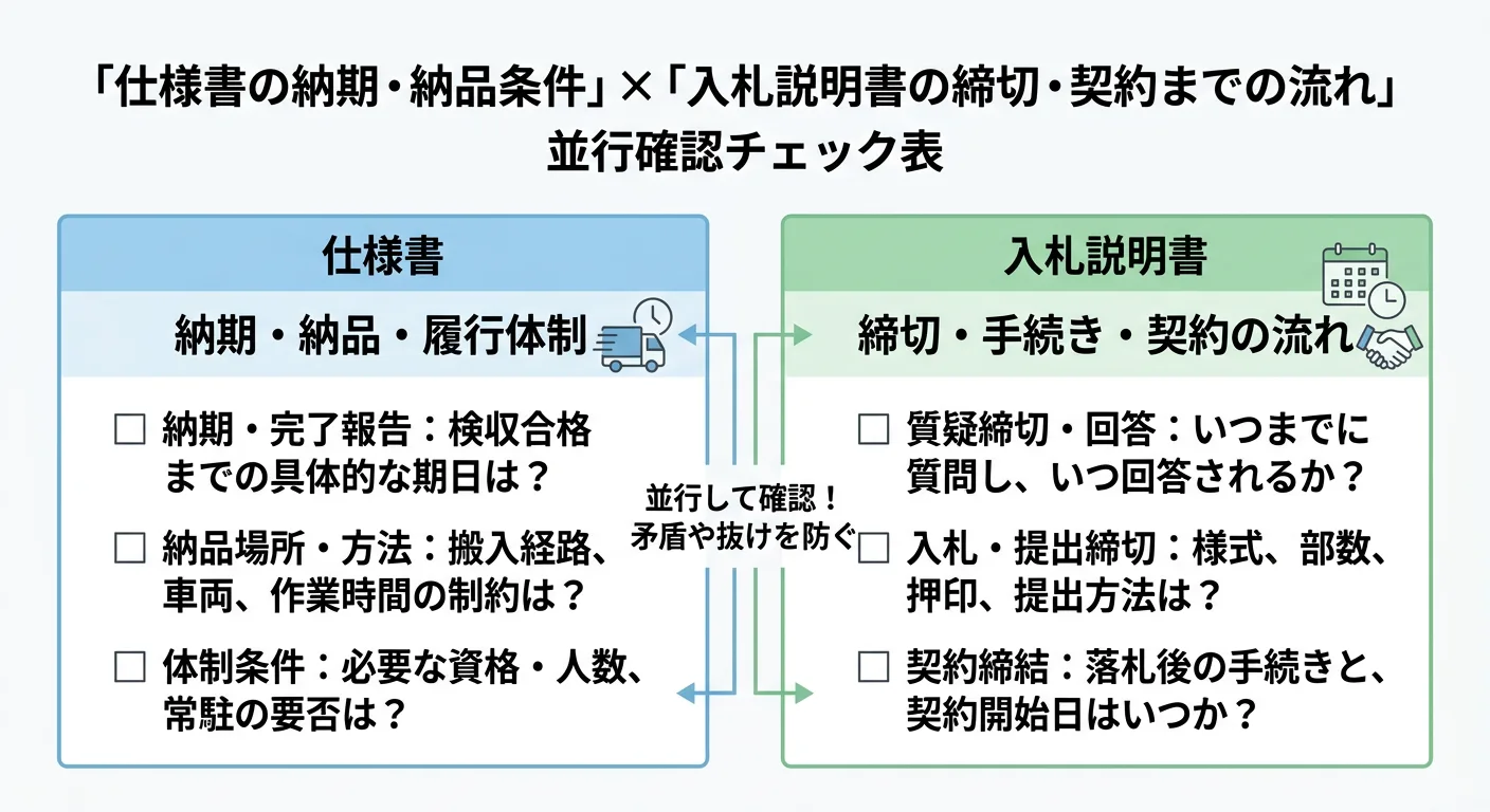 加えて、入札説明書側には入札全体のスケジュール(質問期限、入札期限、開札、契約締結など)が書かれます。仕様書の納期と突合し、実行可能な工程になっているか確認してください。入札説明書に「手続き上の重要事項」がまとまる点は、入札説明書で確認すべきポイントが参考になります。