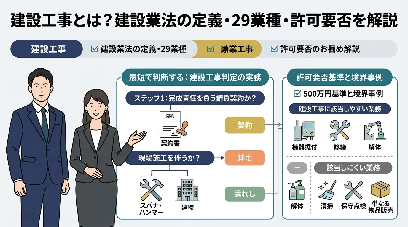 建設工事とは?建設業法の定義・29業種・許可要否を実務フローで解説【500万円基準・境界事例付き】