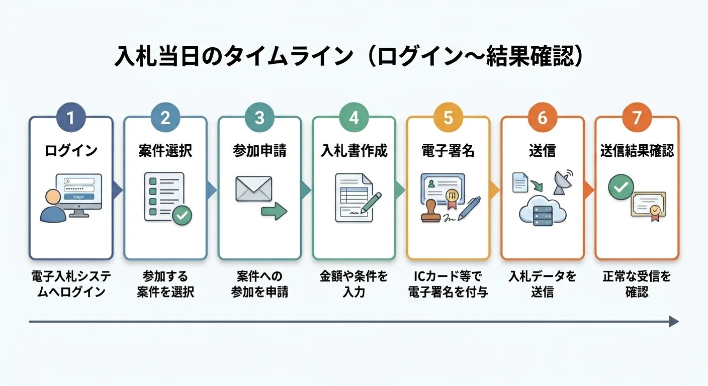 準備が整ったら、いよいよ案件対応です。一般的には「案件を検索し、参加申請(参加表明)を行い、入札予定日にICカードで入札書を電子送信する」という流れになります。送信時は、クライアントソフトやWeb画面の操作に沿って電子署名・暗号化が適用されるとされています(流れの確認は調達ポータルの利用手順および電子送信の説明が近いイメージです)。