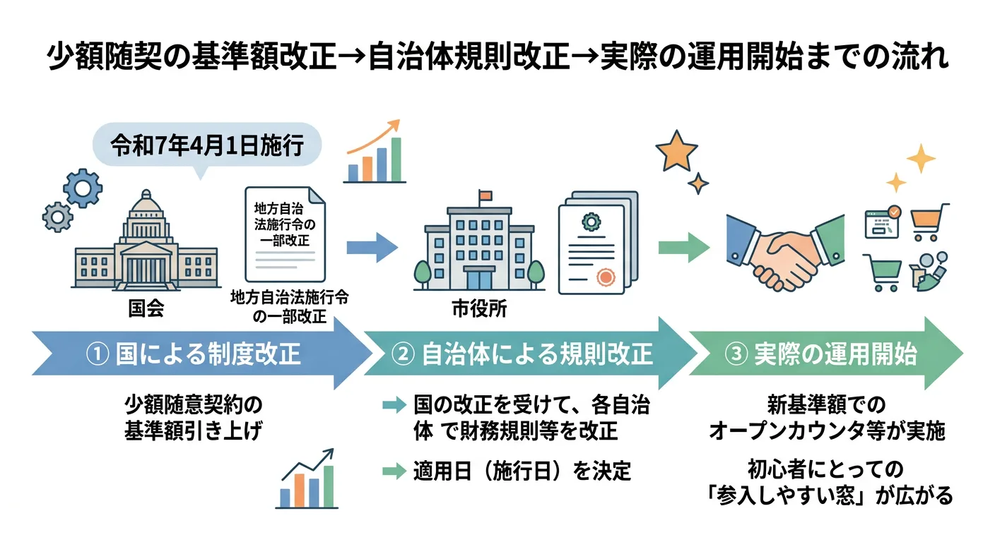 少額随意契約の基準額は、地方自治法施行令の一部改正により引き上げられ、令和7年4月1日施行とされています。制度改正により、これまで入札だった規模がオープンカウンタ等に移行する可能性があり、初心者にとっては「参入しやすい窓」が広がる場面も出てきます。