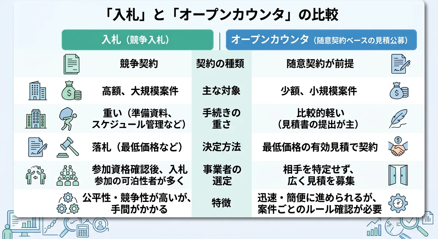 初心者が混乱しやすいのは、「入札に参加するのと同じノリでオープンカウンタも行けるのか?」という点です。両者は似ている部分もありますが、実務上の前提が違います。