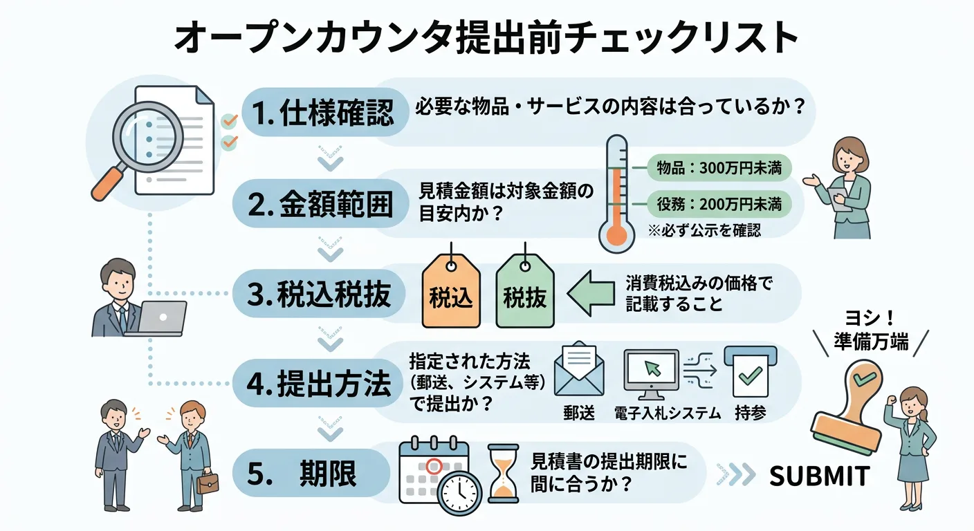 オープンカウンタは見積の勝負になりやすい反面、参加条件を満たしていないと、どれだけ価格を頑張っても土俵に上がれません。特に次の項目は最初に確認します。