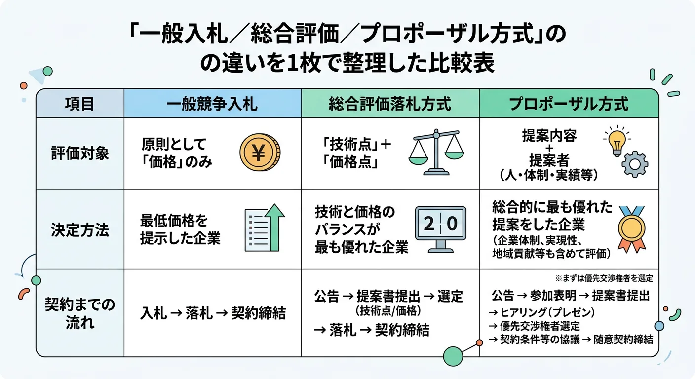 コンペ・一般入札・総合評価・プロポーザルのざっくり整理