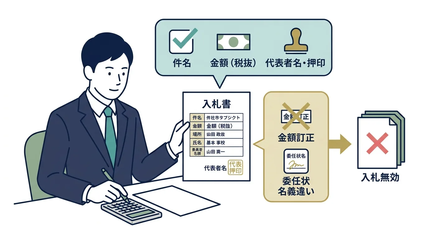 特に注意したいのは、価格の良し悪しより前に、書き方や提出方法のミスで入札が無効になることがある点です。実務では「金額を訂正してしまった」「委任状の名義が合わない」「封筒の案件名と入札書の件名が違う」といった初歩的なミスが起こりがちです。