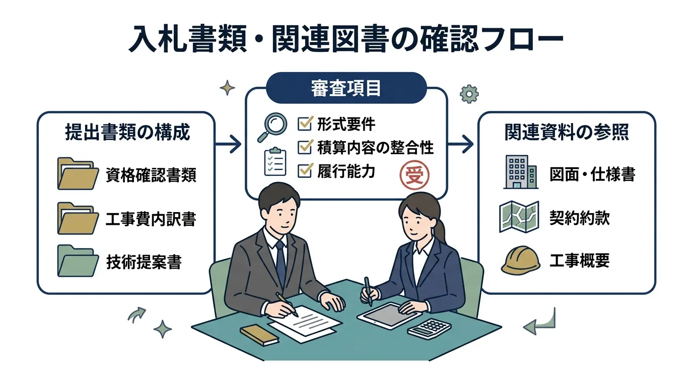 最初に確認したいのは、案件の正式名称、契約番号、提出期限、提出方法、必要書類、押印要否、封筒の指定です。とくに「入札書」「委任状」「内訳書」「封筒」の4点はセットで確認してください。