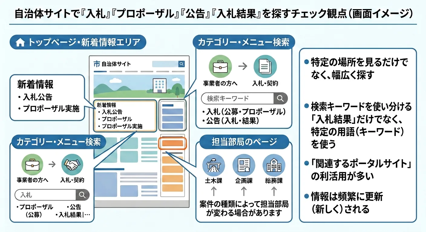 特にプロポーザル(企画提案)は掲載場所が分散しがちで、自治体の「新着情報」や、担当部局のページに出るケースがあります。定期巡回が前提になるため、探し方の型を決めておくと運用しやすくなります。
