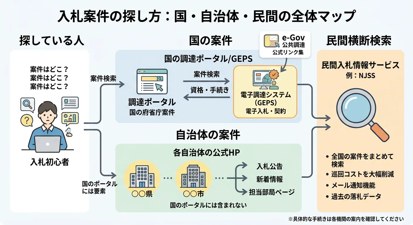 入札案件の探し方|初心者が最初に使うべきサイト・ポータル5選(国・自治体・横断検索)