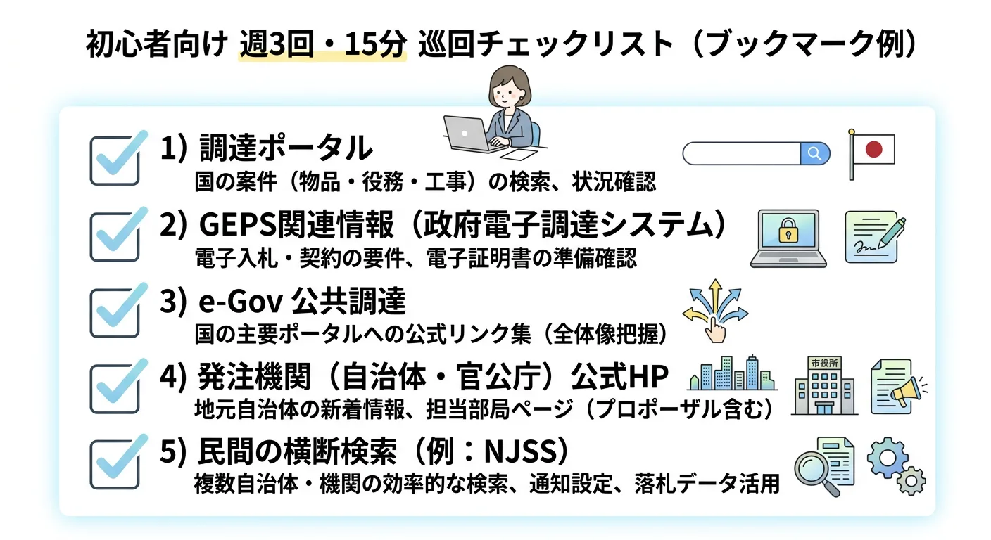 初心者ほど、「国の公式入口」→「公式のリンク集」→「狙う自治体のHP」→「横断検索で工数削減」の順に当たりを付けると、取りこぼしと手戻りが減ります。特に自治体案件は、国のポータルだけを見ていると自然に漏れてしまいます。